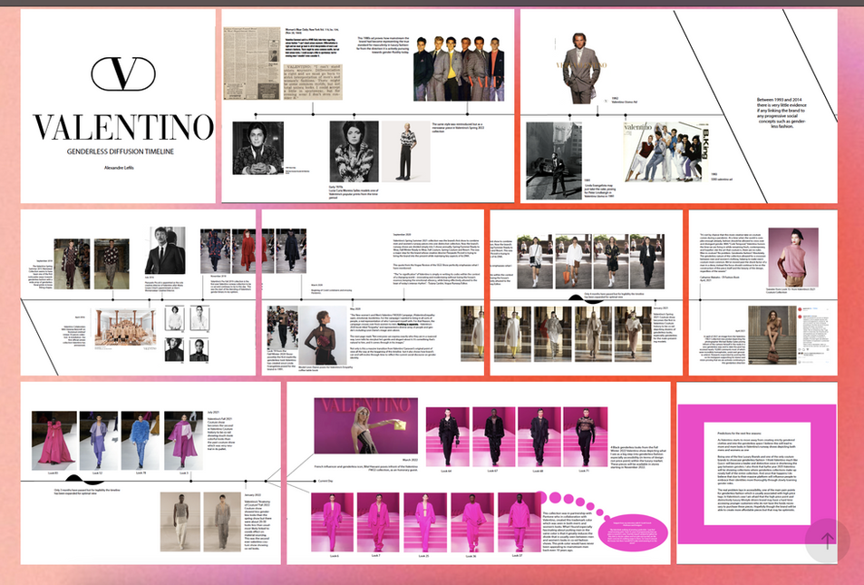 This project aims to become a comprehensive resource for Genderless Fashion, especially trying to highlight and tackle the concepts of sizing and accessibility. I created 2 extensive timelines which look over the intricacies of genderless fashion’s diffusion into mainstream society. One of my timelines was exclusive to Valentino’s genderless fashion diffusion and the other looks broadly over genderless fashion diffusion since the 1950s. I also created a couple garment prototypes as well as other ethnographic and primary research tidbits including behind the scenes fashion week footage. Finally to help highlight lesser known designers, I included a genderless designer of the month spotlight section which will continue displaying each month a new up and coming genderless designer currently studying at or having recently graduated from Parsons.